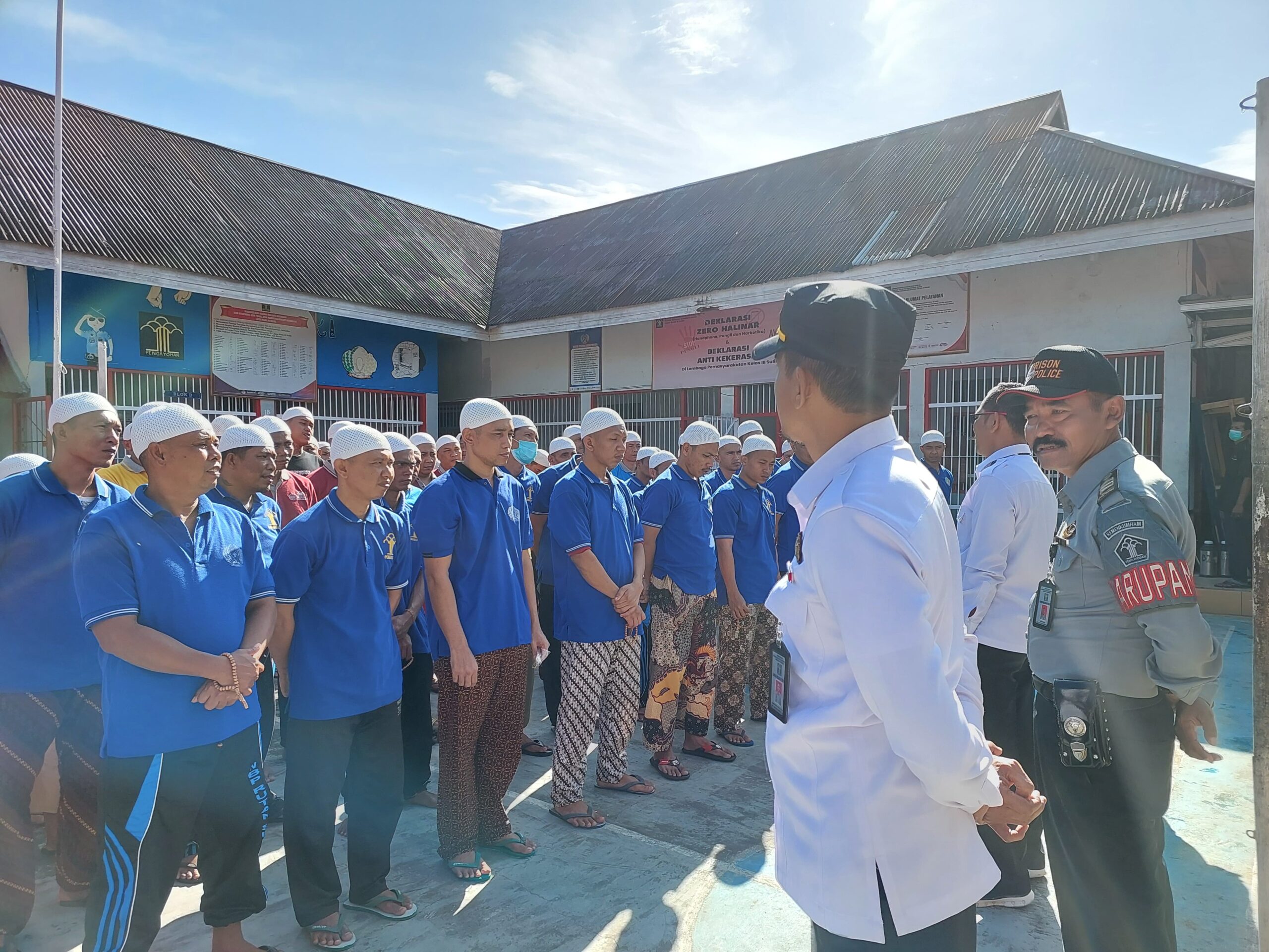 Kepala Lembaga Pemasyarakatan Kelas III Suliki, Kamesworo Bersama jajaran Kasubsi, membagikan 1 paket Perlengkapan ibadah yang berisi peci dan Tasbih.