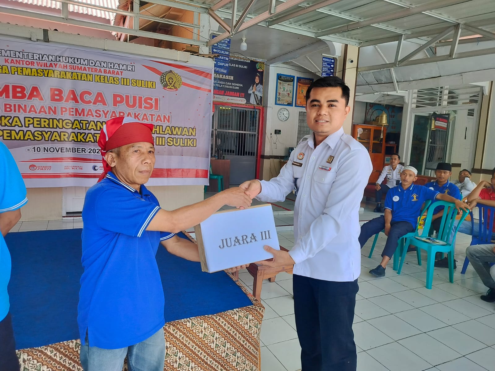 Dalam memperingati Hari Pahlawan Tahun 2023, Lapas Suliki juga menggelar Lomba Puisi Bertemakan Pahlawan yang diikuti oleh warga binaan, perwakilan masing-masing blok hunian mengikuti lomba puisi bertemakan pahlawan, sebanyak 15 peserta akan menampilkan kreasi puisinya dalam memeriahkan peringatan Hari pahlawan ke-78 tahun 2023 dan diambil yang terbaik dalam penilaian tersebut, diambil juara 1,2 dan 3.