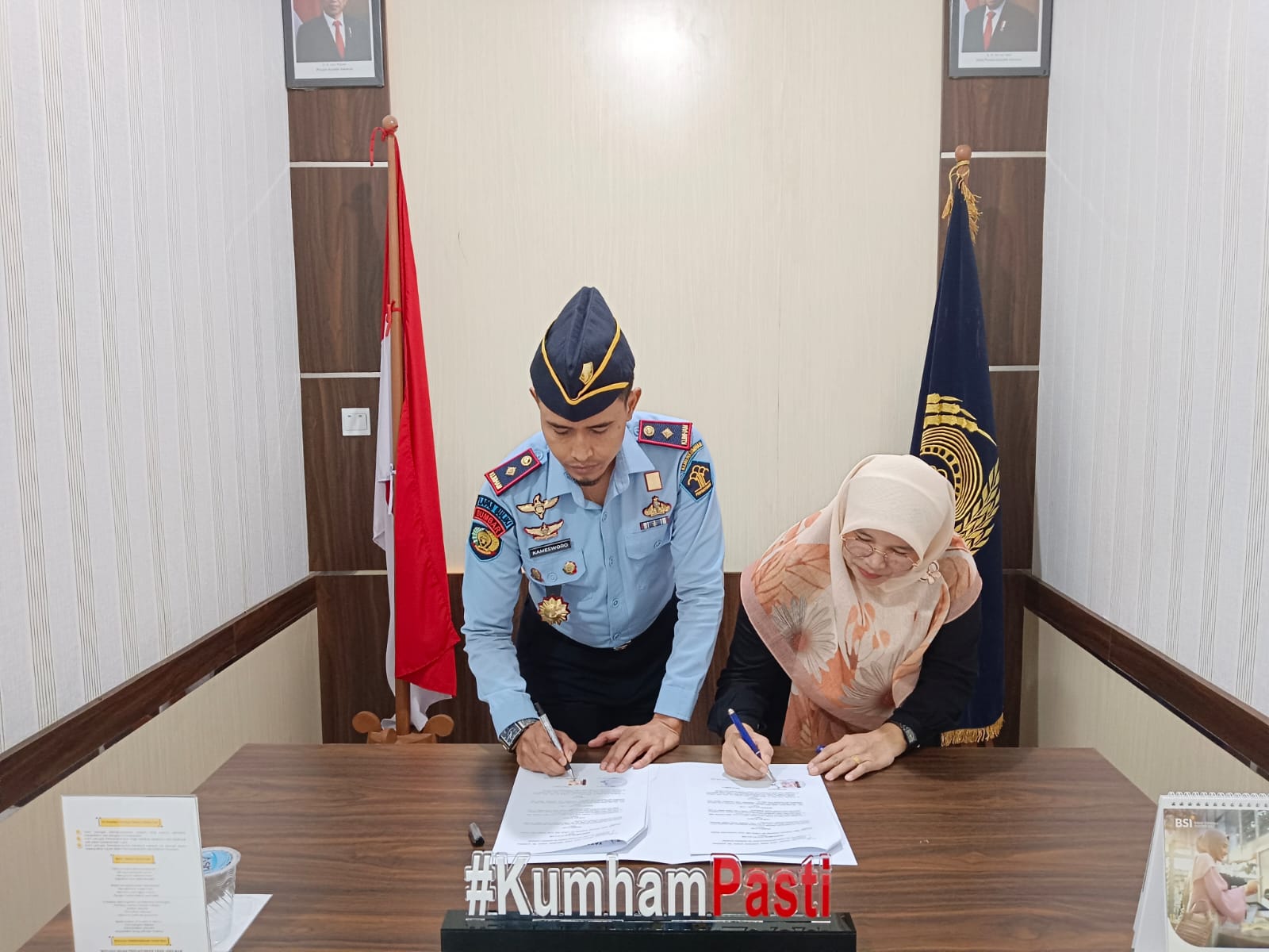 Lima Puluh Kota – Kepala Lembaga Pemasyarakatan Kelas III Suliki, Kamesworo lakukan Perjanjian Kerja Sama (PKS) Bersama Nengka Putri dari Yayasan Pusat Kegiatan Belajar Masyarakat (PKBM) Literasi yang berkedudukan di Jorong Kurai Nagari Kecamatan Suliki Kabupaten Lima Puluh Kota, (9/5/23)