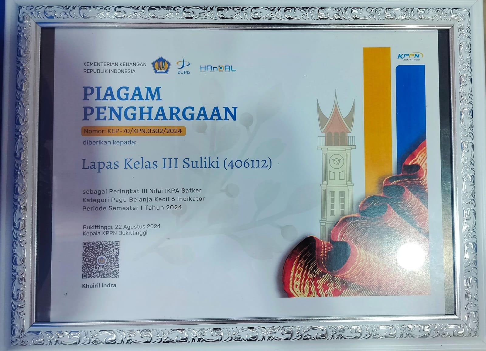KPPN Bukittinggi memberikan Piagam penghargaan dengan nomor kep-70/KPN.0302/2024 diberikan kepada Lapas Kelas III Suliki sebagai peringkat III Nilai IKPA Satker kategori Pagi Belanja Kecil 6 Indkator Periode Semester 1 Tahun 2024.