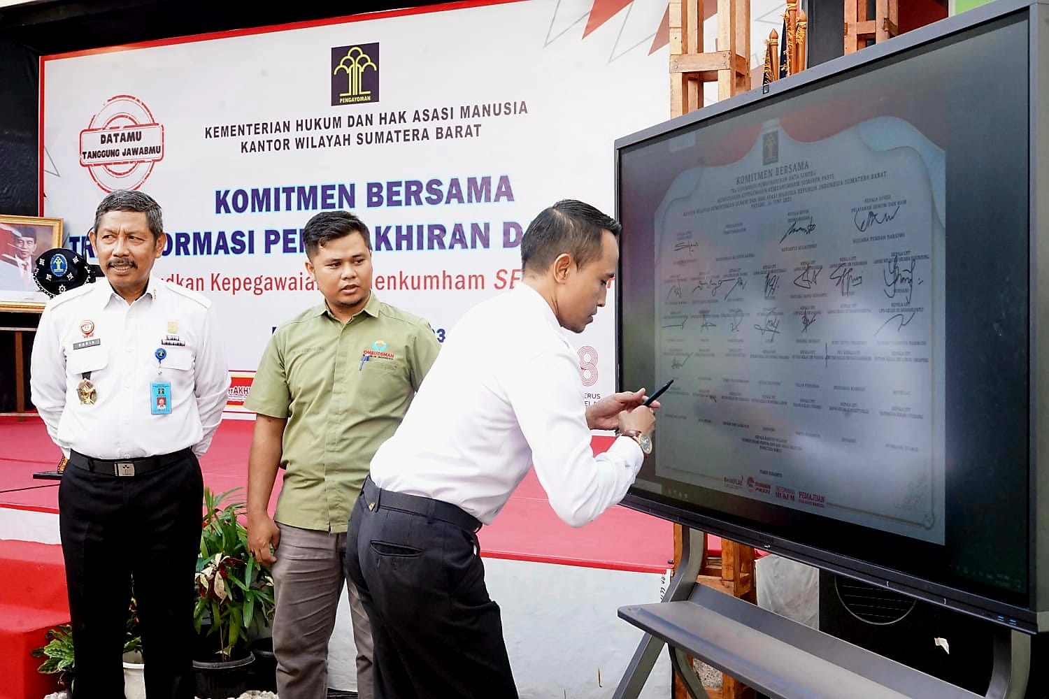 Acara Dilanjutkan Dengan Penandatangan Komitmen Bersama Tranformasi Pemutakhiran Data Simpeg Diawali Oleh Kepala Kantor Wilayah Kemenkumham Sumbar, Haris Sukamto Dan Dilanjutkan Oleh Kepala Divisi Administrasi, Ramelan Suprihadi Serta Dilanjut Oleh Para Kepala Unit Pelaksana Teknis (Ka.Upt) Se-Sumatera Barat.