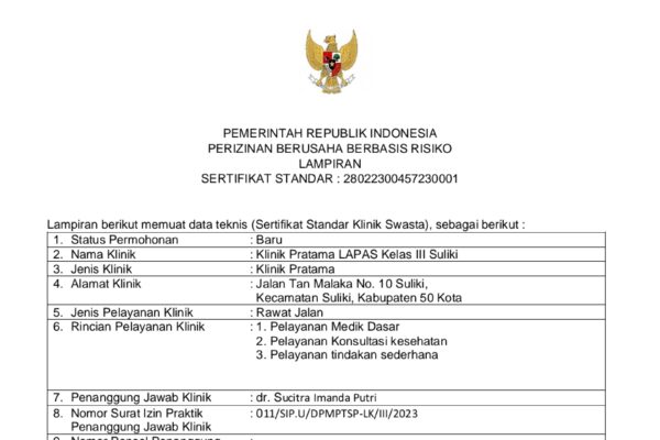 dr Meiza Hadiri Peresmian Klinik dan Apresiasi percepatan izin klinik di lapas suliki. Lima Puluh Kota – Lembaga Pemasyarakatan Kelas III Suliki telah mendapatkan izin pendirian klinik pratama pada tanggal 6 April 2023 dan diresmikan tanggal 12 April 2023 bersama Kepala Divisi Pemasyarakatan Kelas III Suliki, Ali syeh Bana. Turut hadir para tamu undangan dari…